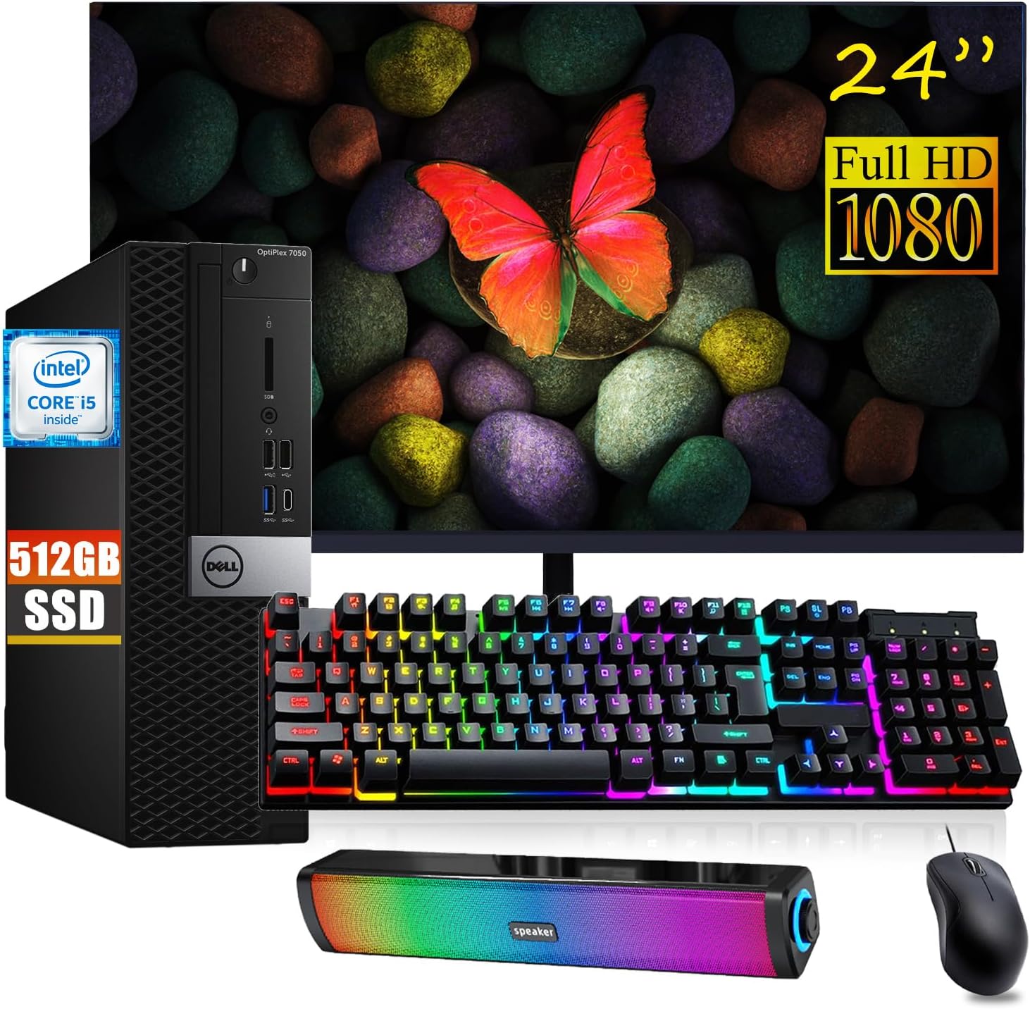 Dell Optiplex 7050 SFF PC Desktop Computer Set, 24″ FHD Monitor, RGB Speaker, Intel Core i5-6th 3.2GHz Up to 3.6GHz, 512GB SSD, 16GB RAM, RGB Keyboard, Mouse, DP Cable, Win 10 Pro(Renewed)